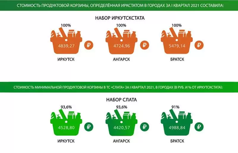 В Иркутске стоимость продуктовой корзины, определенная Иркутскстатом, в первом квартале этого года составила 4839,27 рубля, в Ангарске – 4724,96 рубля, в Братске – 5479,14 рубля. В «Слате» аналогичный такой же продуктов можно было купить в Иркутске – за 4528,80 рубля или на 6,42% дешевле, в Ангарске – за 4420,57 рубля или на 6,44% дешевле, в Братске – за 4988,84 рубля или на 8,95% дешевле.
